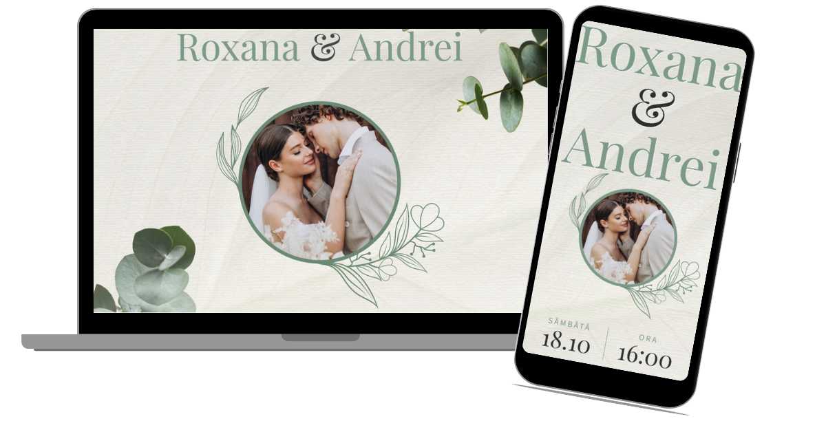 Cu „Eucalyptus Elegance”, fiecare detaliu contează, transformând invitația voastră într-o experiență digitală memorabilă, ce reflectă frumusețea și armonia zilei speciale.
